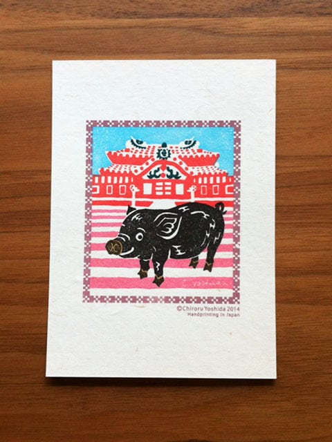 \ ラスト1 /【沖縄特産月桃紙使用/手刷り版画】琉球ポストカード<アグーと首里城>